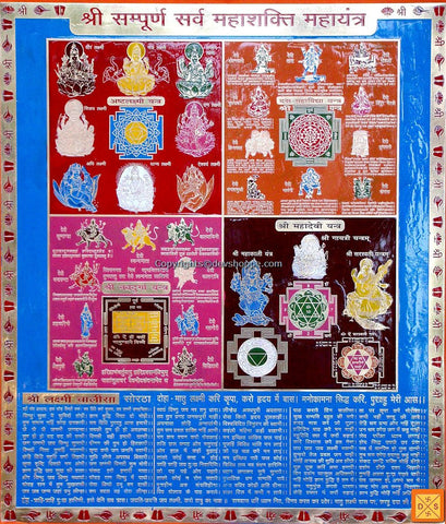 Sri Sampurn Sarv Mahashakti Mahayantra is Super Powerful yantra that carries four very popular and powerful yantra in itself. This single yantra carries yantras of almost all popular goddesses in Hinduism. This yantra also carries Sri Lakshmi Chalisa .The list of yantras is as following :- Sri Ashtalakshmi yantra Sri Das Mahavidya yantra Sri Nav Durga yantra Sri Mahadevi yantra Sri...