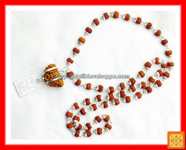 This powerful combination of 1 faced rudraksha and silver Surya yantra is hanged in rudraksha mala of five faced beads bindid in silver.